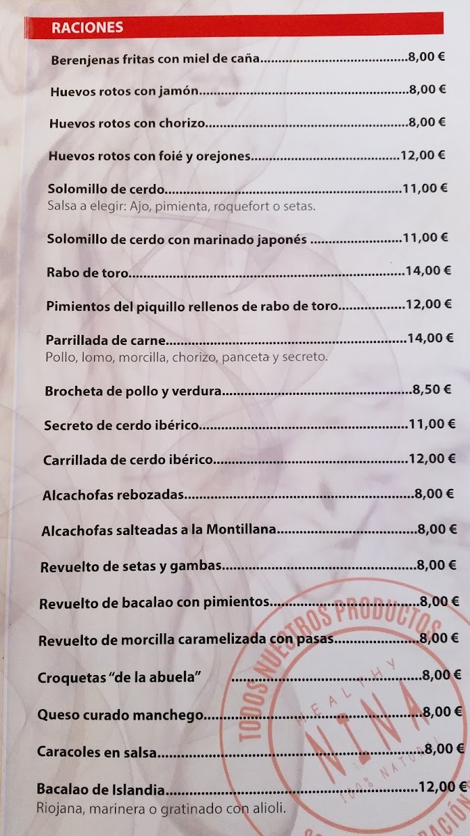 For lunch, the grill takes center stage with standout dishes like Secreto de Cerdo Ibérico and Presa de Cerdo, both grilled to perfection and priced around €12.00. If you’re in the mood for sharing, options like Flamenquín Cordobés and Croquetas are ideal for a tapas experience. With friendly service and a cozy atmosphere, Nina is a must-visit for food lovers in Granada.